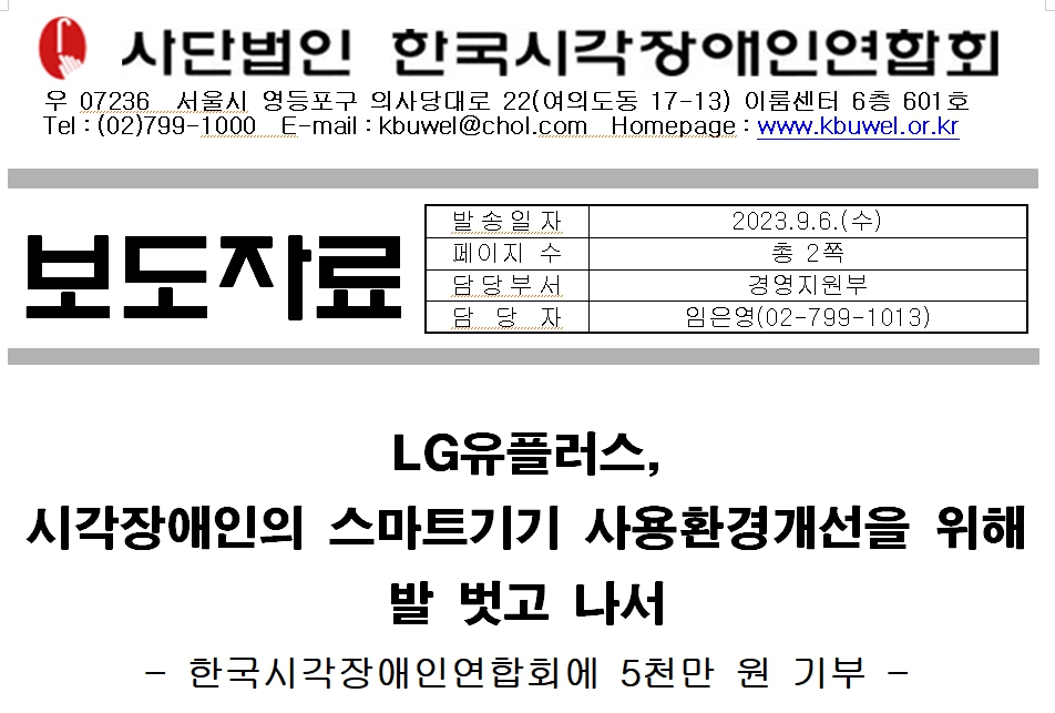 LG유플러스(대표이사 황현식)는 『제44회 흰지팡이날』을 앞두고, ‘시각장애인의 스마트기기 사용환경개선’을 위해 한국시각장애인연합회(이하 한시련)에 5천만 원을 기부하였다. 기부금 전달은 9월 5일(화) 오전 10시, LG유플러스 ESG추진실 이홍렬 실장과 한시련 김영일 회장 등 관계자들이 참석한 가운데 이룸센터에서 진행되었다.