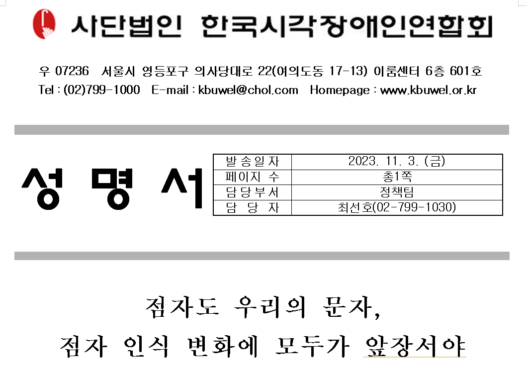 「점자법」은 시각장애인의 점자 사용 권리를 신장하고 점자에 대한 국민의 관심과 이해를 높이기 위해 매년 11월 4일을 ‘한글 점자의 날’로 정하고 있다. ‘한글’과 동일한 효력을 지닌 ‘점자’는 아직 공적 문자로 인정받지 못하고 있거니와, 시각장애인은 필요한 자료와 문서를 ‘점자’로 즉시 제공받지도 못하고 있다. 한국시각장애인연합회는 제97돌 ‘한글 점자의 날’을 맞아 송암 박두성 선생의 사상을 계승하고 발전시켜나갈 것을 약속한다. 시각장애인의 정보접근권 향상과 소비자로서의 권리가 완벽하게 향유되도록 정부와 지자체 및 공공기관 그리고 모든 사업자가 점자 사용 환경 개선에 적극적으로 나설 것을 강력히 요구하며 이의 관철을 위하여 끊임없이 감시할 것이다.