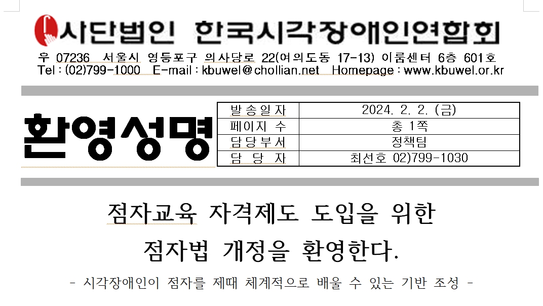 (사)한국시각장애인연합회(회장 김영일)는 점자법이 개정되기까지 노고를 아끼지 않으신 정부와 국회 모든 관계자들에게 감사의 뜻을 전한다. 또한 점자 교원 자격 제도가 제대로 시행되도록 점자 교원 자격 요건 및 자격 심사 규정 신설 등 법 개정 후속 조치를 위한 점자법 시행령이 차질없이 개정되길 기대한다.