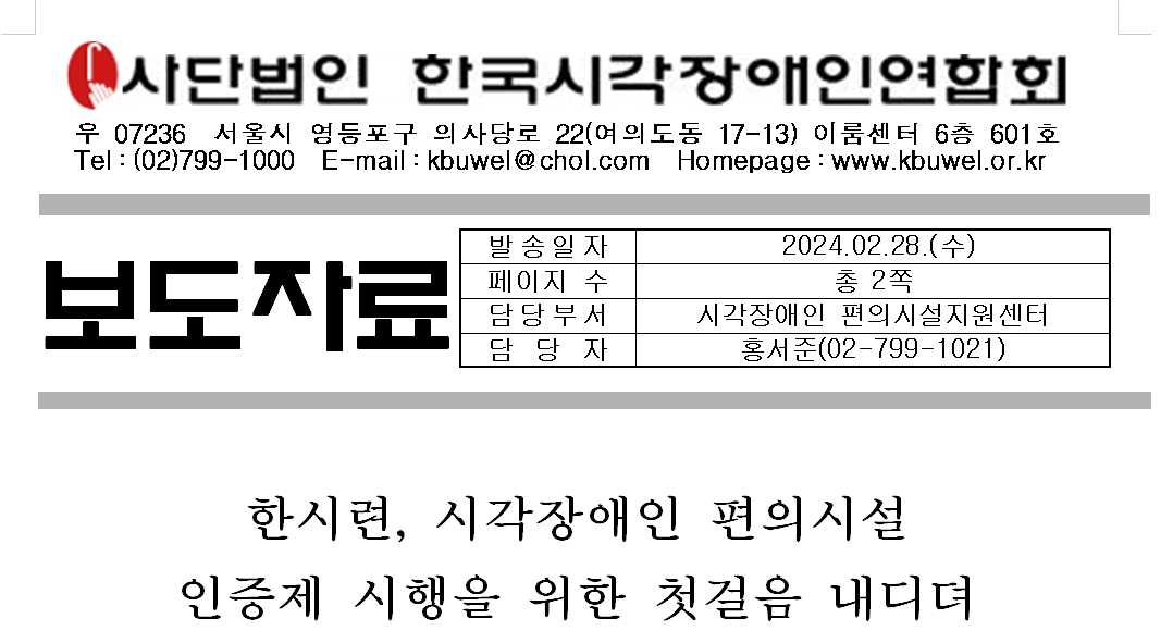 한시련 김영일 회장은 “1997년 「장애인·노인·임산부 등의 편의증진 보장에 관한 법률」이 제정된 지 26년이 지났지만, 시각장애인 편의시설 설치 실태는 아직도 열악한 상황”이라며, “공급 단계에서부터 적합한 시각장애인 편의시설의 납품과 설치가 이루어질 수 있는 장치가 필요하다”라고 강조했다.