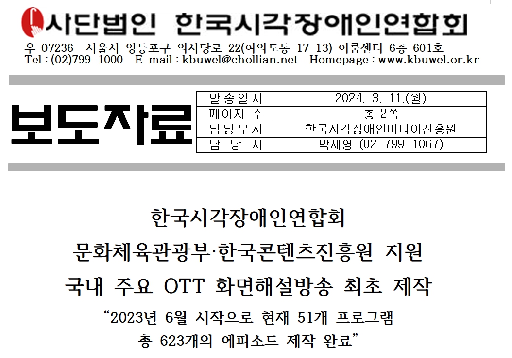 (사)한국시각장애인연합회(한시련, 회장 김영일)는 문화체육관광부와 한국콘텐츠진흥원의 지원을 받아 국내 주요 OTT 플랫폼의 화면해설방송을 최초로 제작했다.
