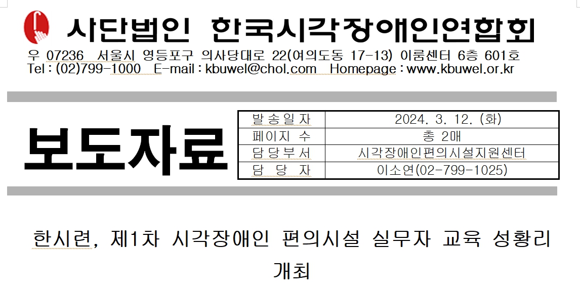 사단법인 한국시각장애인연합회(이하 한시련, 회장 김영일)는 3월 7일부터 1박 2일 일정으로 경기도 화성시 소재 푸르미르 호텔에서 제1차 시각장애인 편의시설 실무자 교육을 성황리에 개최했다.