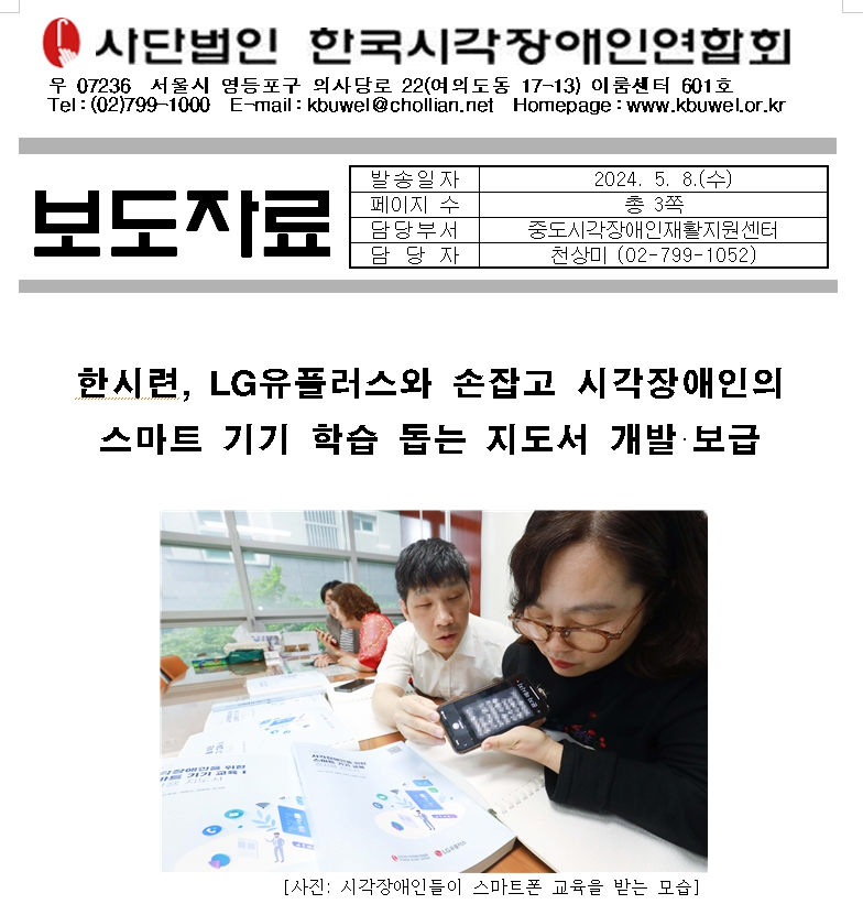본 지도서는 지난해 LG유플러스가 시각장애인의 디지털 역량 개발을 위해 한시련에 기부한 5천만원으로 개발된 것으로, 시각장애인을 위한 강사용 지도서로서는 최초 출간이다.