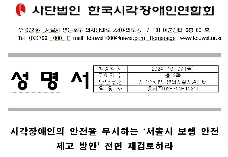 지난 9월 24일 서울시가 보행자의 안전을 최우선으로 고려해야 할 횡단보도에 자동차 진입 억제용 말뚝(이하 '볼라드')을 무분별하게 설치할 계획을 발표하여 시각장애인의 안전한 보행권을 위협하고 있다. 지난 7월 시청역 인근 차량 보도 역주행 사고로 시민들의 불안감이 높은 가운데 보행자의 안전을 보장하기 위해 서울시가 내놓은 계획이지만 보행 약자인 시각장애인의 안전은 안중에도 없는 '빛 좋은 개살구'에 불과하다. 무분별하게 설치하면 오히려 크고 작은 안전사고 위험이 있는 볼라드를 확대 설치하려는 행태에 대해 한국시각장애인연합회는 깊은 유감의 뜻을 표명한다.