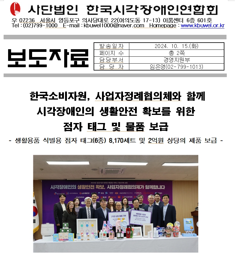 한국소비자원(원장 윤수현)은 흰지팡이날*을 맞아 사업자정례협의체** 참여기업과 함께 생활용품 식별용 점자 태그 및 스티커와 시각장애인 친화 제품을 보급한다.