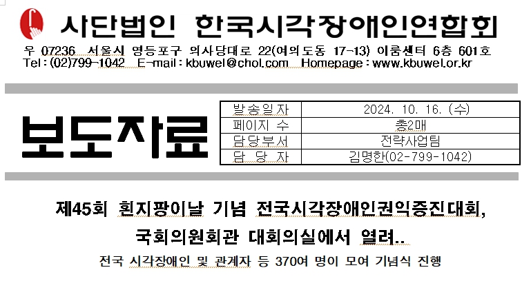 [보도자료]제45회 흰지팡이날 기념 전국시각장애인권익증진대회, 국회의원회관 대회의실에서 열려..1