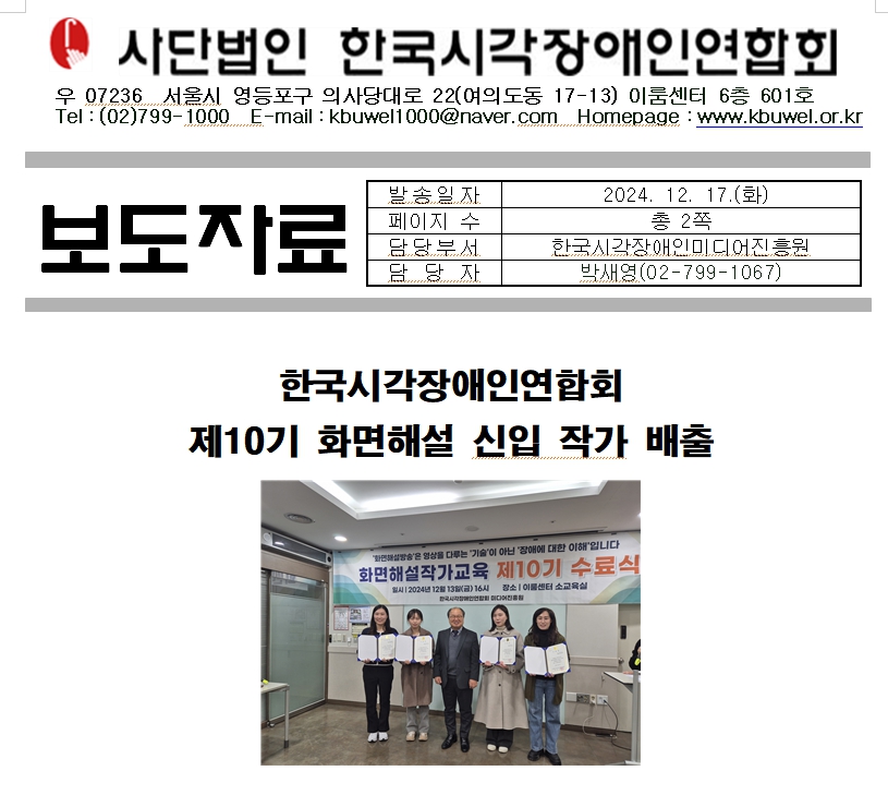 한국시각장애인연합회(이하 ‘한시련’)는 12월 13일(금) 오후 3시, 서울 여의도 이룸센터에서 제10기 화면해설 작가교육 수료식을 성황리에 개최했다.