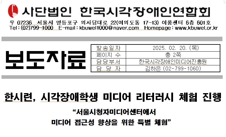 사단법인 한국시각장애인연합회(이하 ‘한시련’)는 2025년 2월 19일, 서울맹학교 학생들을 대상으로 미디어 리터러시 체험 프로그램을 진행했다. 이번 프로그램은 시청자미디어재단 서울시청자미디어센터와 협력하여 마련되었으며, 시각장애 학생들의 정보 접근성 향상과 미디어 활용 역량 강화를 목표로 하여 진행되었다.