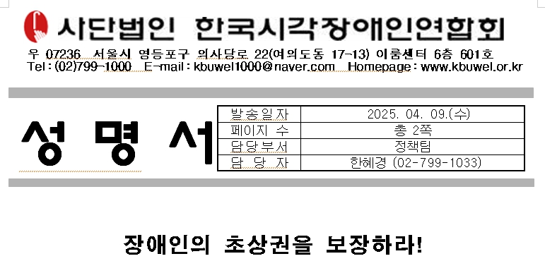 이에 한국시각장애인연합회는 다음과 같이 강력히 요구한다.