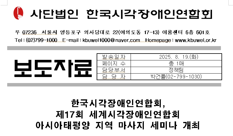 세계시각장애인연합회 아시아태평양 마사지위원회가 주최하고 사단법인 한국시각장애인연합회(한시련)가 주관하는 제17회 세계시각장애인연합회 아시아태평양 지역 마사지 세미나가 오는 8월 27일부터 29일까지 서울 여의도 콘래드 호텔에서 열린다. 2년마다 아태 지역을 순회하며 열리는 본 세미나는 한국에서 2010년에 이어 두 번째로 개최된다.