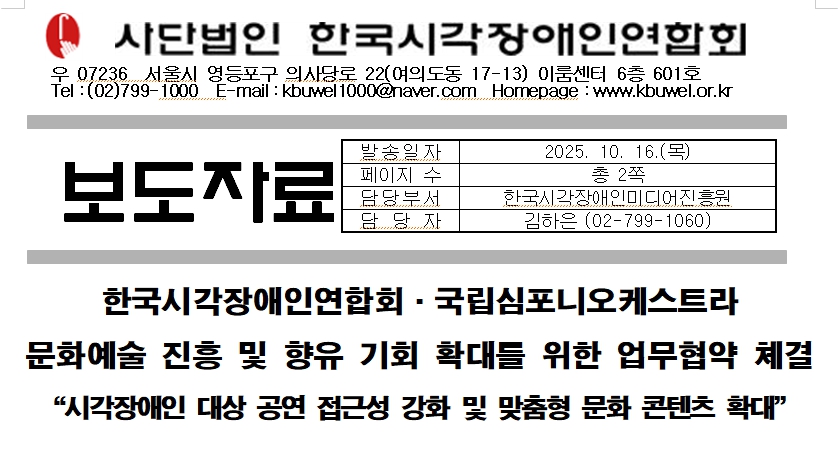 사단법인 한국시각장애인연합회(이하 ‘한시련’)는 국립심포니오케스트라(이하 ‘국립심포니’)와 문화예술의 공공성 실현 및 시각장애인의 문화 접근성 향상을 위해 업무협약을 체결했다. 한시련은 10월 15일(수) 이룸센터에서 국립심포니와 업무협약을 맺고, 시각장애인의 공연 접근성을 강화하고, 문화예술 향유 기회를 넓히는 데 힘을 모을 예정이다.