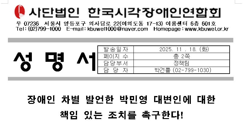 한국시각장애인연합회는 국민의힘이 이번 사안을 엄중하게 인식하고 책임 있는 조치를 취할 것을 촉구한다. 국민의힘 장동혁 대표는 박민영 대변인의 사퇴를 반려하며 “논란은 정리하되 인재는 지킨다”고 밝힌 바 있다. 그러나 기본적 인권 감수성과 민주주의의 원칙을 훼손한 인물을 인재로 평가한다면, 정당에 대한 국민의 신뢰는 더욱 멀어질 수밖에 없다. 공당으로서 스스로 천명한 가치와 책임정치의 기준에 부합하는 조치를 취해 주기를 촉구한다.