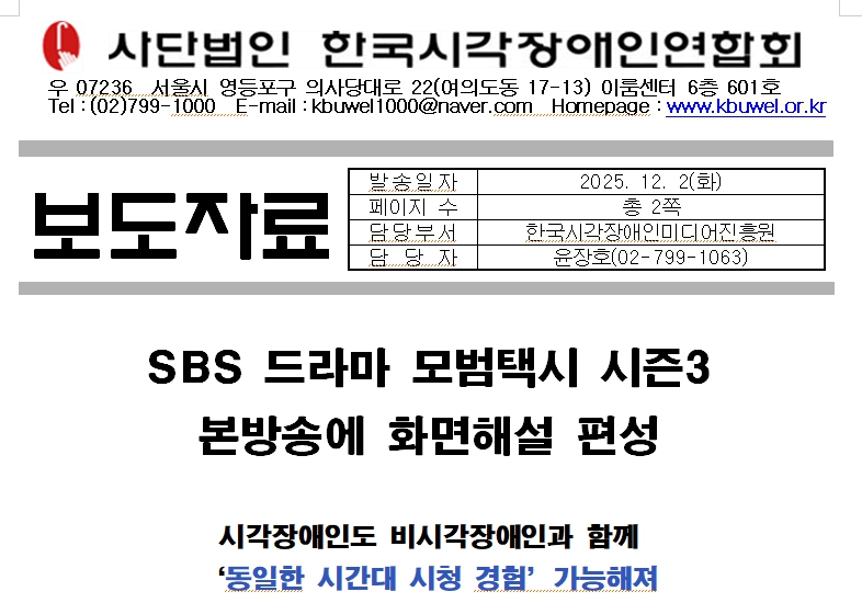 사단법인 한국시각장애인연합회(이하 ‘한시련’)는 SBS에서 방영 중인 드라마 <모범택시 시즌3>가 본방송 시간대에 화면해설을 제공하고 있다며, 시각장애인이 비시각장애인과 동일한 시간에 작품을 시청할 수 있는 환경이 강화되었다고 밝혔다.