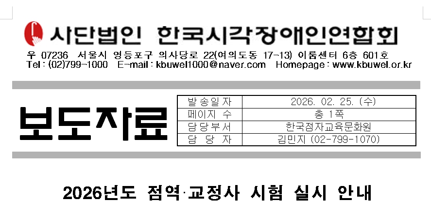 사단법인 한국시각장애인연합회는 2026년도 점역·교정사 시험을 상반기와 하반기 두 차례 실시한다. 상반기(제49회) 시험은 4월 25일(토), 하반기(제50회) 시험은 10월 24일(토)에 광운인공지능고등학교(노원구 광운로1길 24)에서 실시된다.(※사정에 따라 시험일 또는 시험장소가 변동될 수 있음)