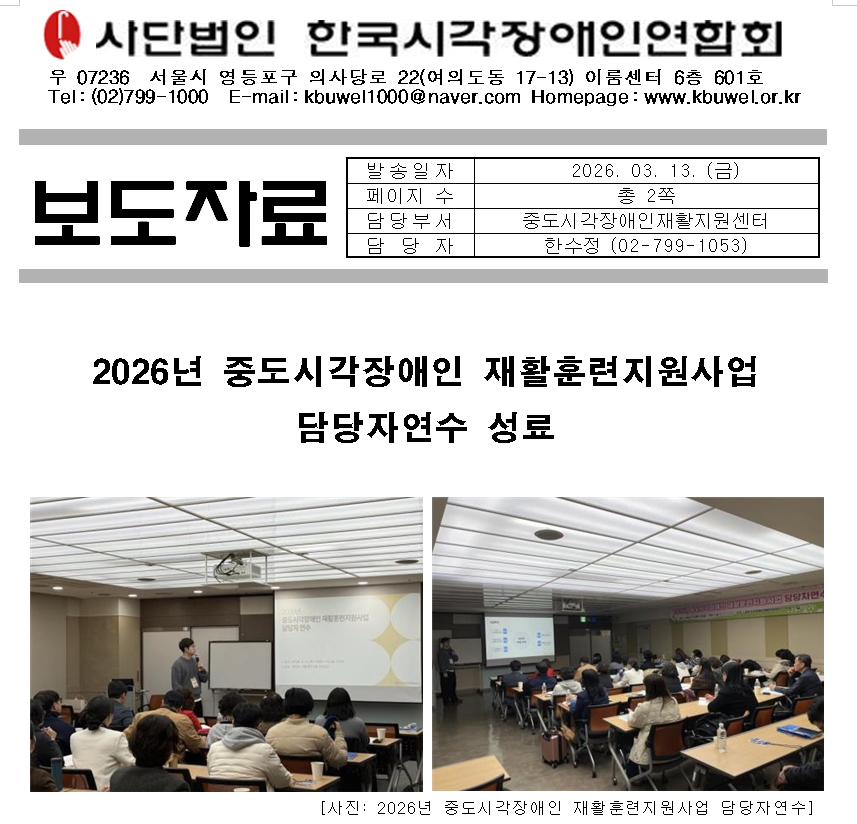 사단법인 한국시각장애인연합회(회장 김영일) 중도시각장애인재활지원센터는 3월 12일(목)부터 3월 13일(금)까지 1박 2일 일정으로 ‘2026년 중도시각장애인 재활훈련지원사업 담당자연수’를 실시했다. 이번 연수는 각 연계지회와 중앙센터 사업 담당자 40여 명이 참여한 가운데 여의도 이룸센터에서 진행됐다.