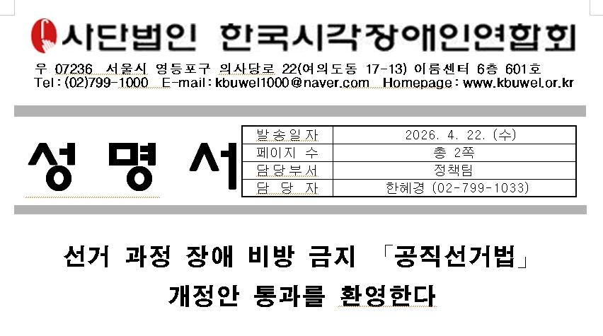 한국시각장애인연합회는 국민의힘 정희용 의원이 대표발의한 「공직선거법 일부개정법률안」의 국회 본회의 통과를 적극 환영한다.