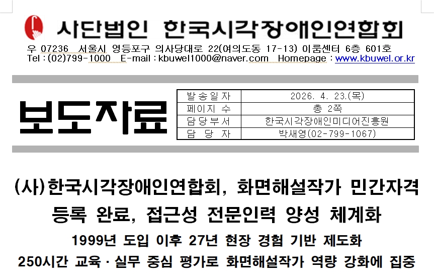 [보도자료] (사)한국시각장애인연합회, 화면해설작가 민간자격 등록 완료, 접근성 전문인력 양성 체계화1