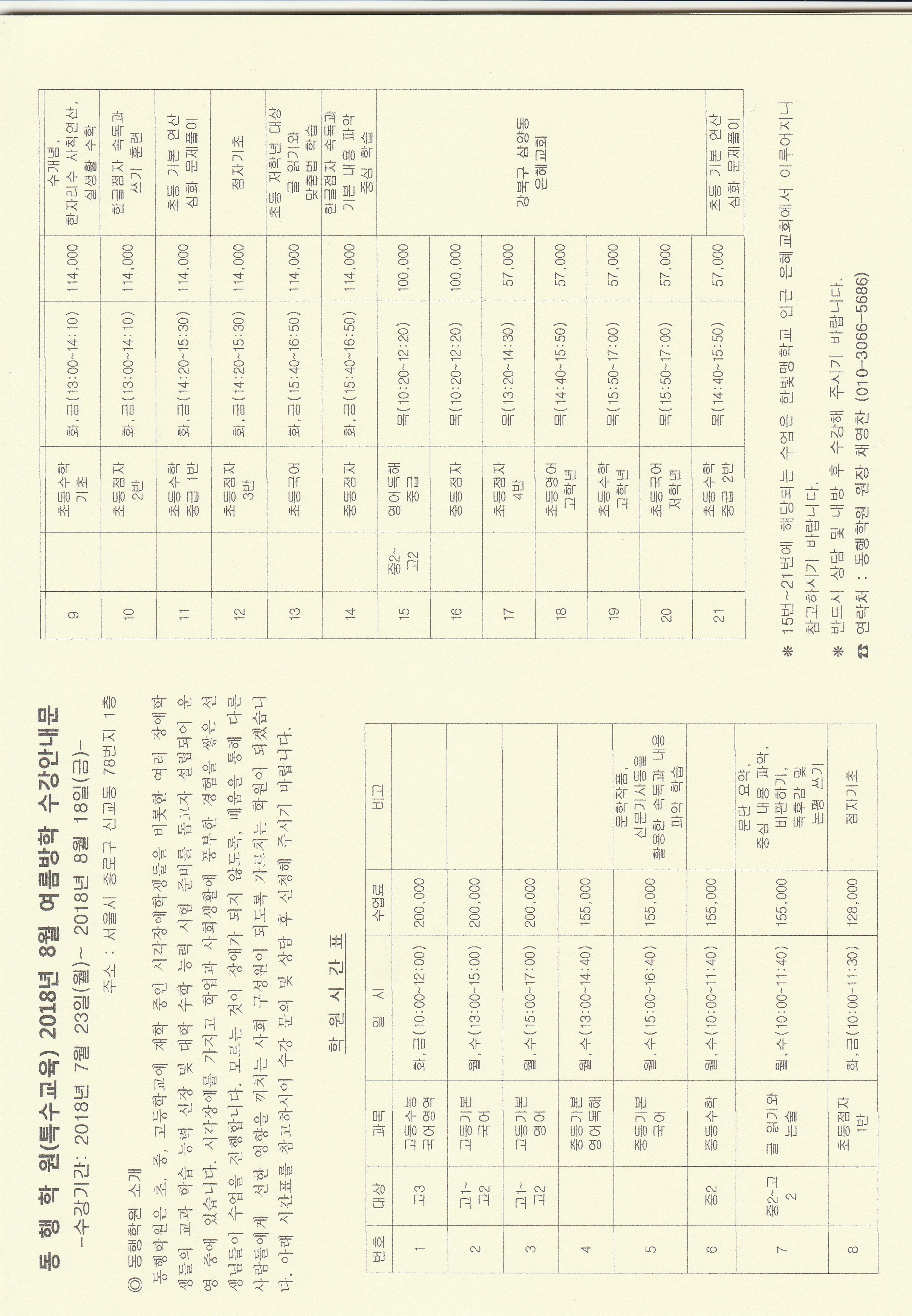 동 행 학 원(특수교육) 2018년 8월 여름방학 수강안내문